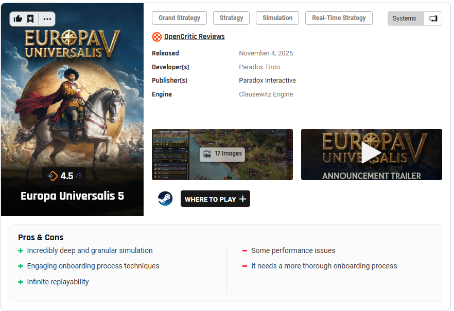 尽管《欧陆风云5》并非完美无瑕,但它仍取得了显著成功——尤其是在其姊妹作《大将军:罗马》虽野心勃勃却遗憾折戟的领域,本作实现了突破。它汲取了Paradox旗下作品的核心精髓——动态人口系统、空前精细的地图呈现、错综复杂的内部派系斗争——并将这些要素完美融合成一个稳定流畅的整体体验,贯穿了那段异常丰富的历史时期。即便在评测版中投入数十小时,我仍感觉仅仅触及皮毛,至今尚未完成过任何一场完整战役;这毕竟是Paradox出品的游戏。而这一点,恰恰是我能给予它的最高赞誉。它令人沉醉,仿佛具有无限重玩价值,其深度胜过马里亚纳海沟,并为大型战略游戏树立了全新标杆。